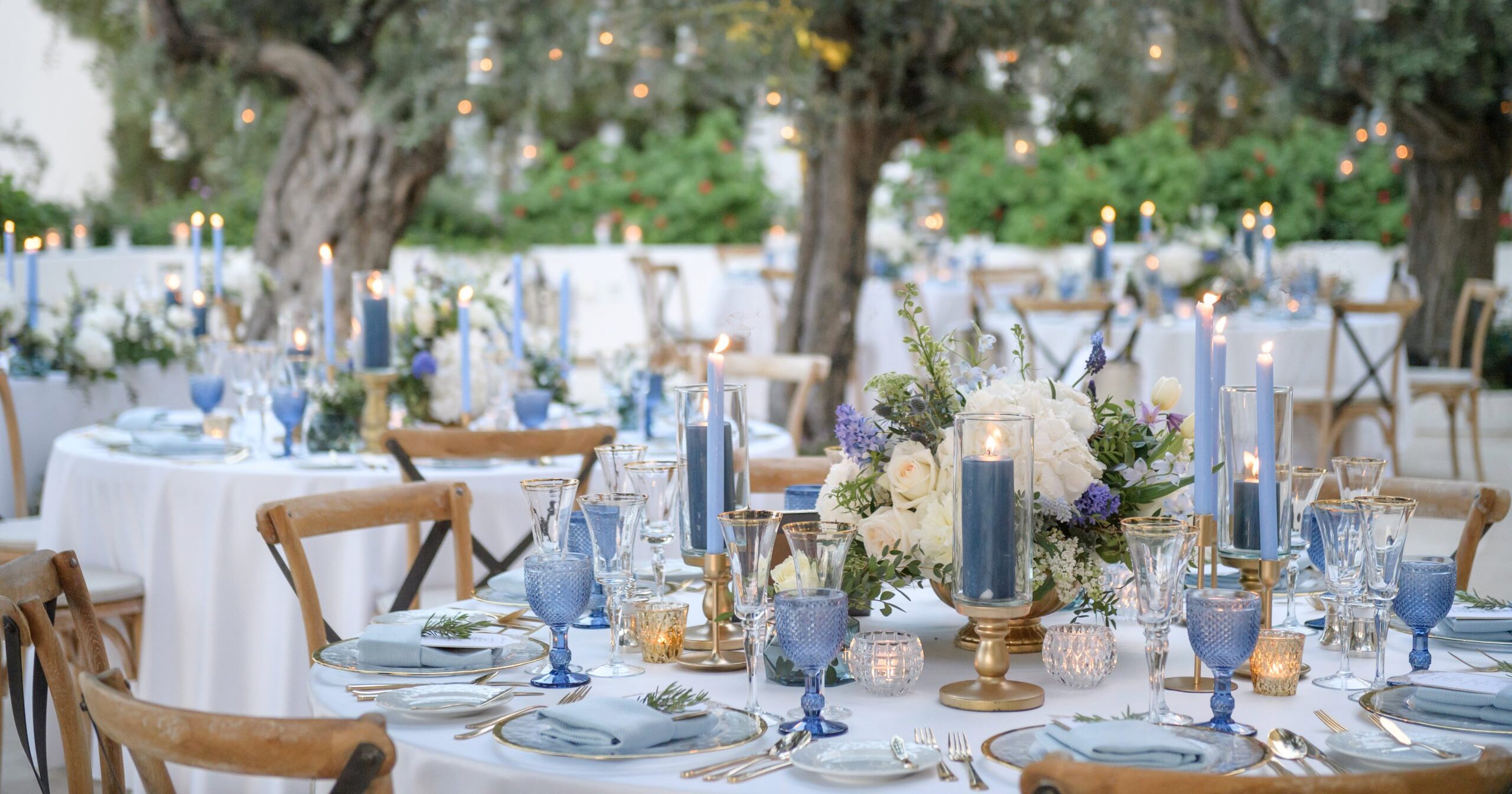 The reception and dinner were set on the terrace, with tables between the olive trees and a view of the coast and sunset. The colour palette featured shades of blue in addition to the white and green, and gold accents.
