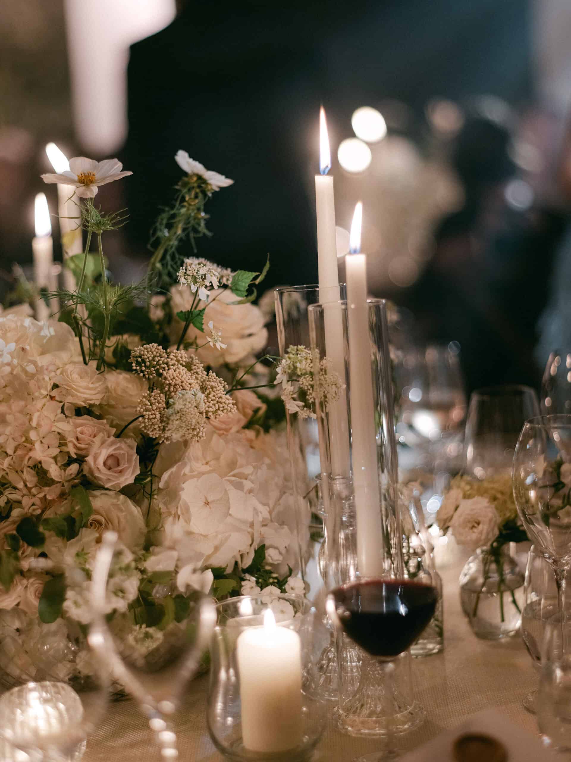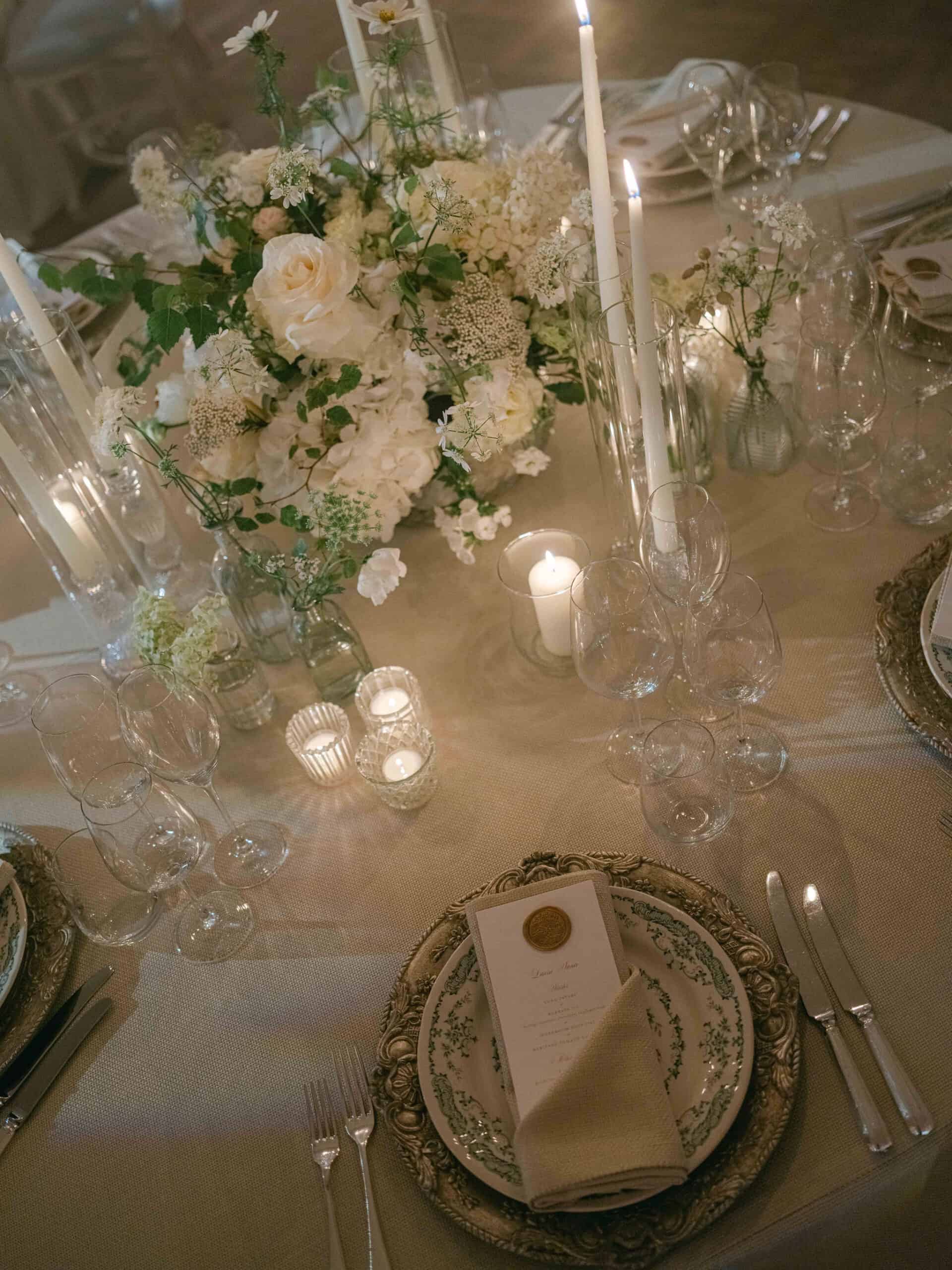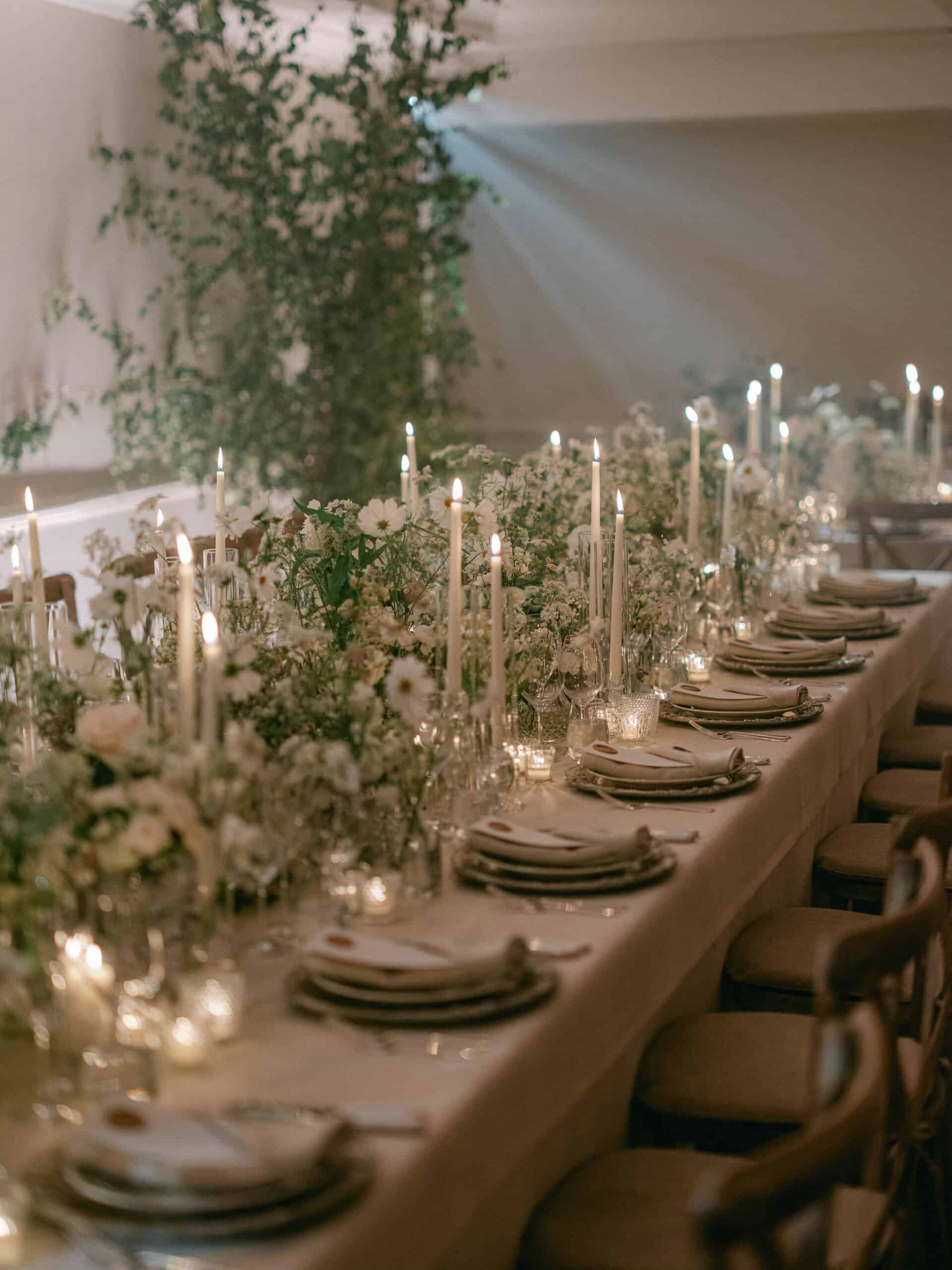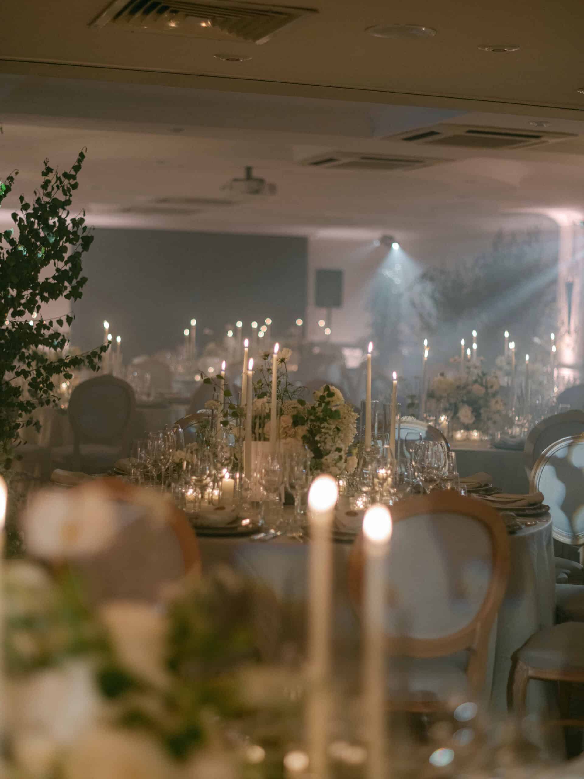 The reception concept was a Dior-esque English secret garden. Dee adores the ‘Toile de Jouy’ motif, which Mr. Dior actually showcased on the walls of his first boutique. We pulled out the delicate imagery and trees from this design to feature in the reception design. We placed silver birch trees around the tables to immerse the guests in our ‘secret garden’. The centrepieces featured delicate English florals of varying heights and textures. One of my favourite flowers used were Cosmos, they are a gorgeous and seasonal English flower, which added so much interest to our overall look. The floral features paired with an ornate and pearlescent tablescape, and some atmospheric haze, created the perfect ambience.