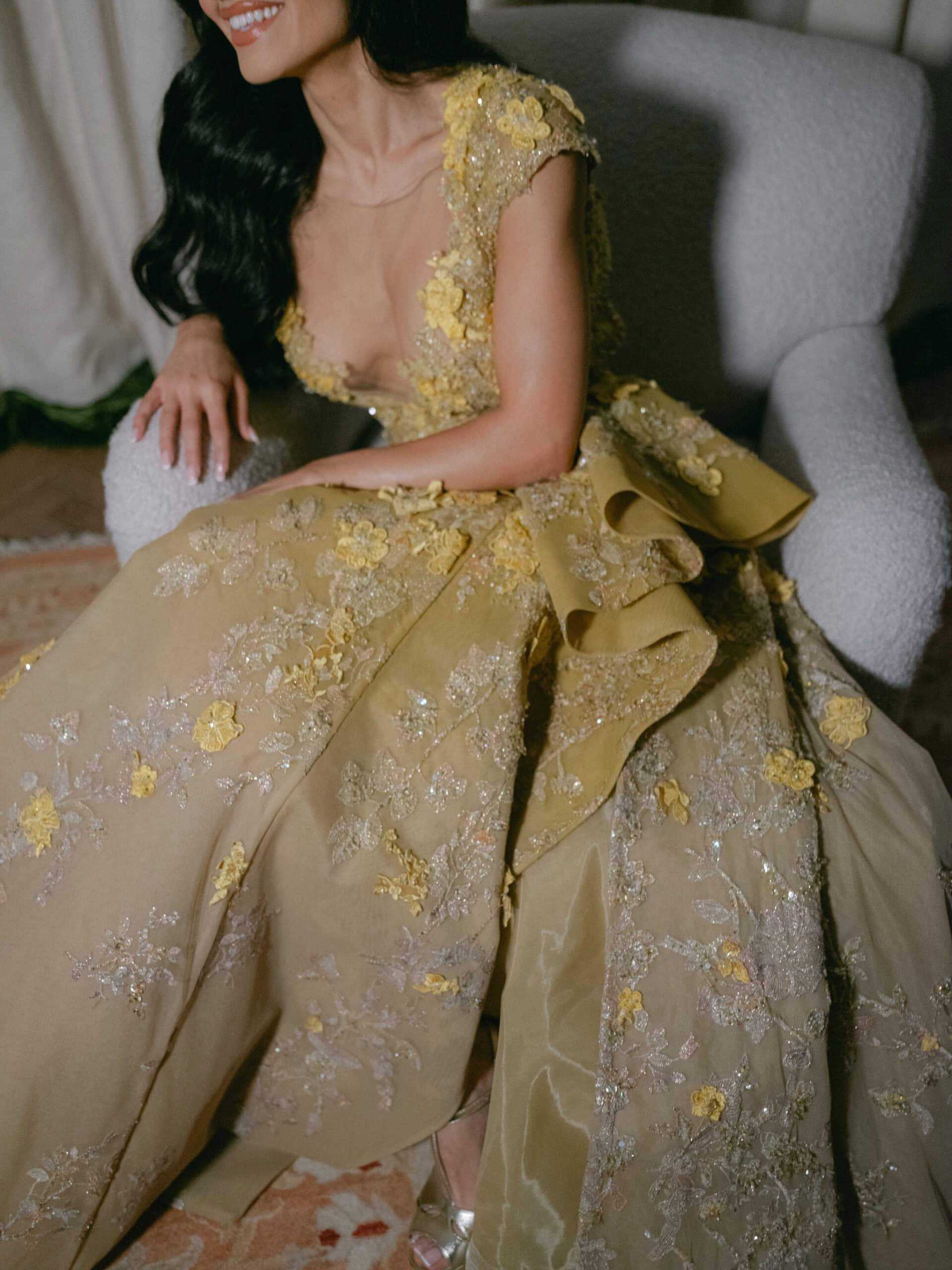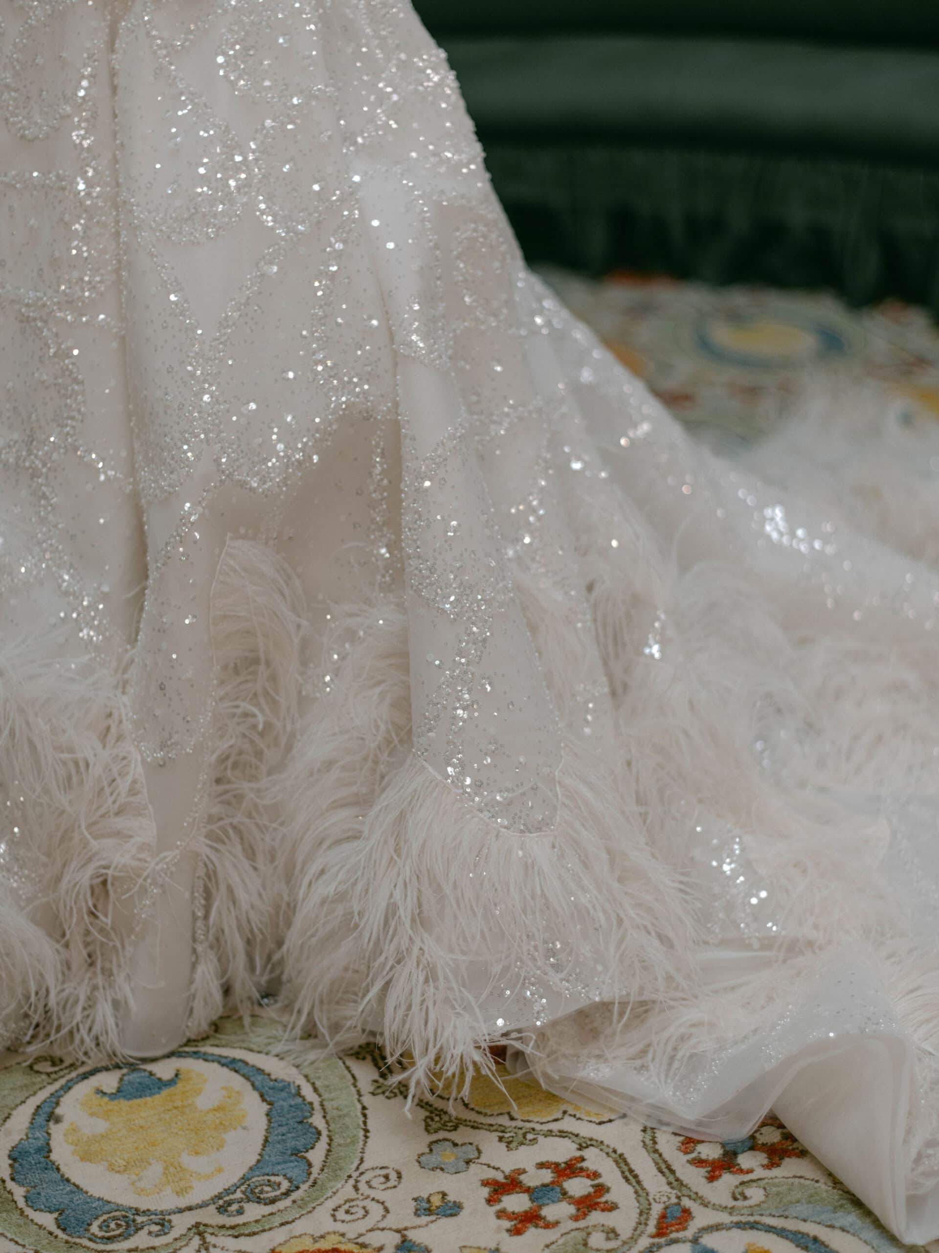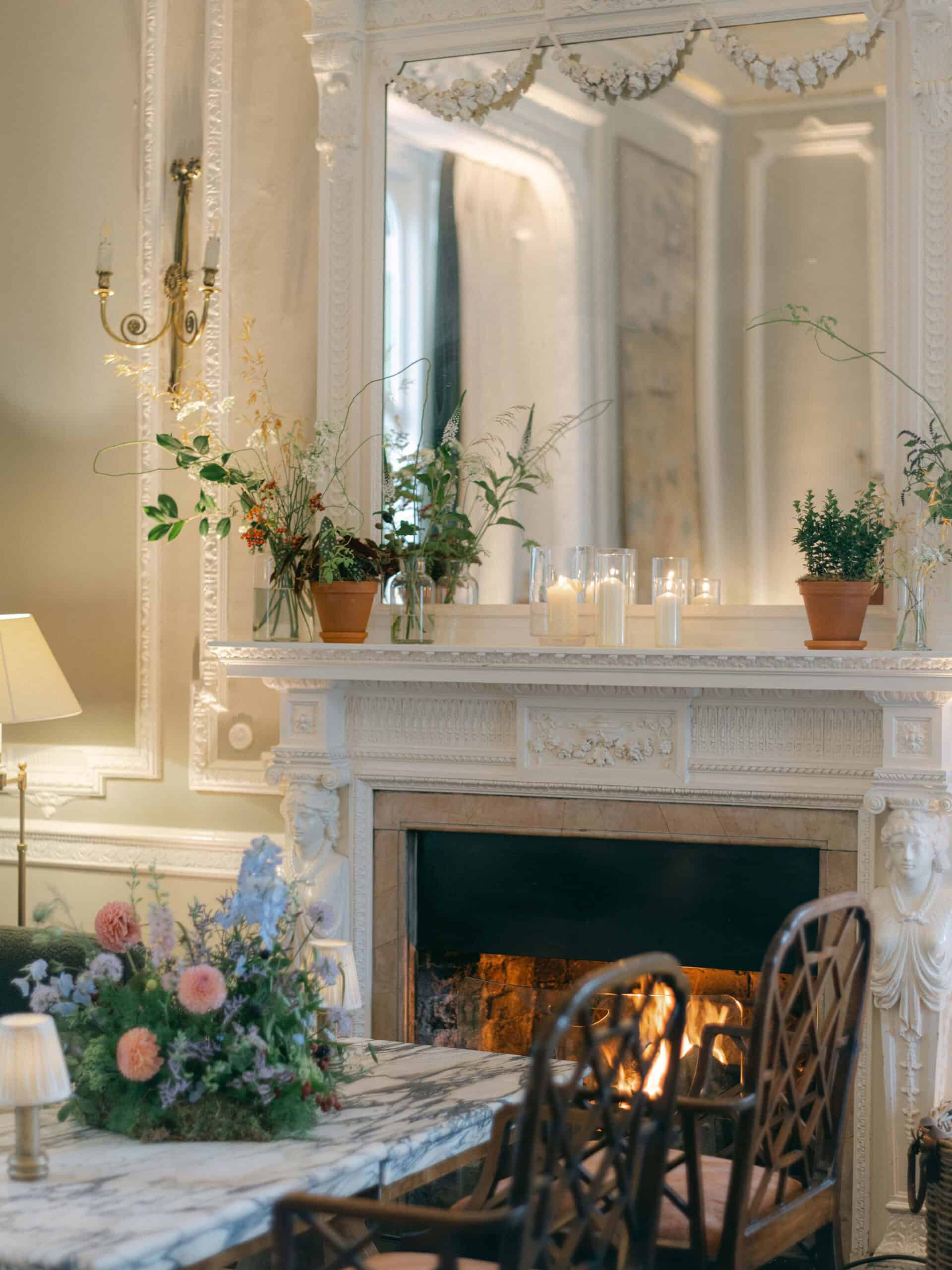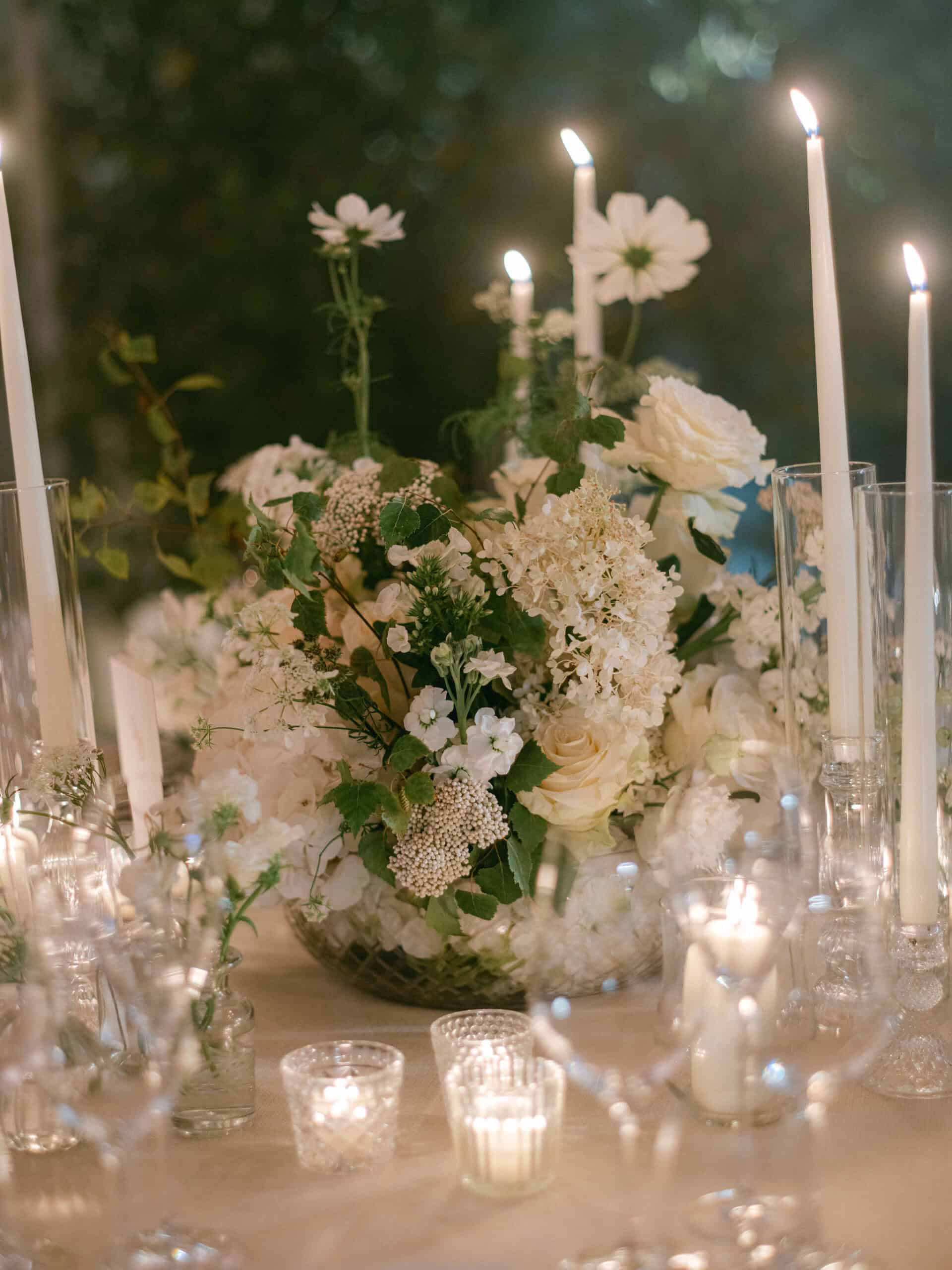 The reception concept was a Dior-esque English secret garden. Dee adores the ‘Toile de Jouy’ motif, which Mr. Dior actually showcased on the walls of his first boutique. We pulled out the delicate imagery and trees from this design to feature in the reception design. We placed silver birch trees around the tables to immerse the guests in our ‘secret garden’. The centrepieces featured delicate English florals of varying heights and textures. One of my favourite flowers used were Cosmos, they are a gorgeous and seasonal English flower, which added so much interest to our overall look. The floral features paired with an ornate and pearlescent tablescape, and some atmospheric haze, created the perfect ambience.