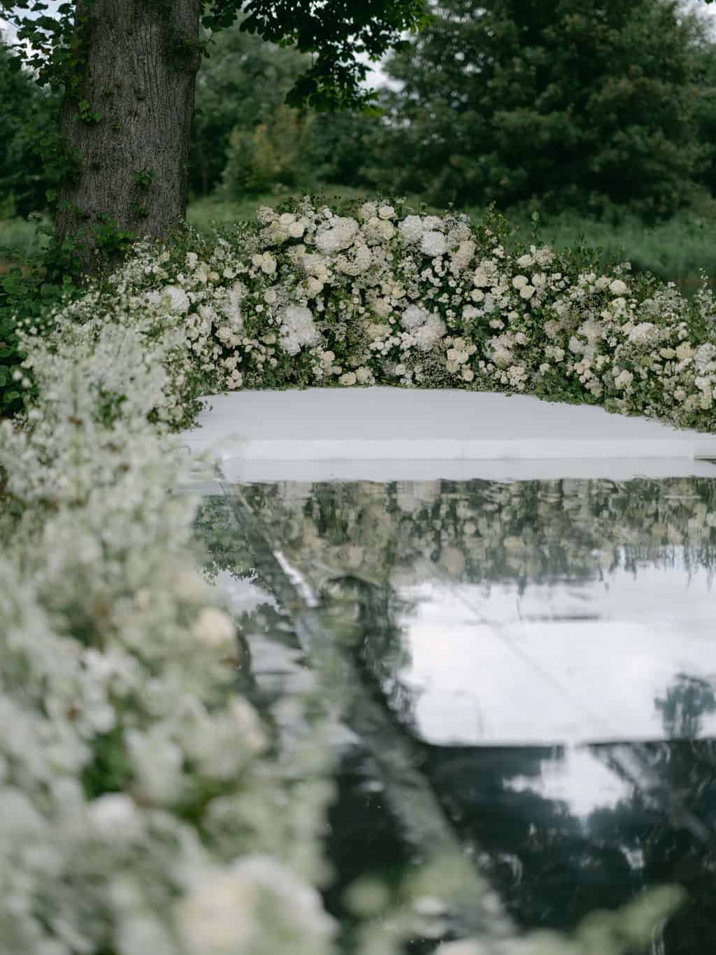The expansive estate gave us 3 different locations for the wedding day. The ceremony was situated directly next to the River Thames. One of the main concepts was for Dave and Dee to seem as though they were ‘walking on water’ along the aisle, hence the fitting location. We explored the idea of having Dave arrive to the ceremony via boat, but this was quickly vetoed as we could not comprehend the possibility of the Groom falling into the Thames pre-ceremony. Instead, we had a bespoke waterfall structure built at the top of the aisle. This was paired with a mirrored aisle which was lined with water troughs. The combination of materials made the reflections on the aisle deceive the eye, as if the couple were truly walking on water.