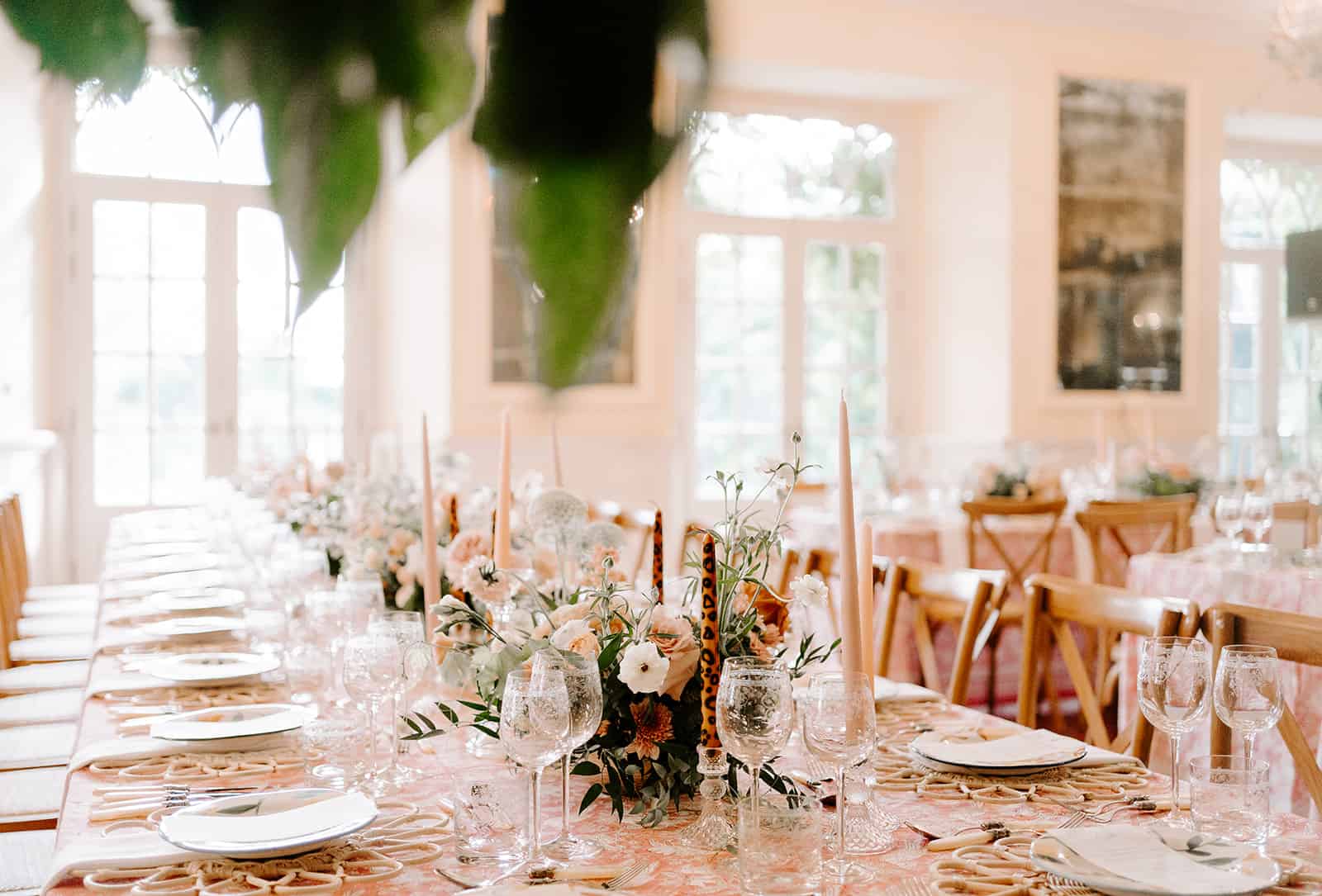 The colour palette was made up of dusty pinks, white and green. Our design focused heavily on transforming the ballroom where we used lots of neutral elements to pull the design together such as wood tone chairs and wicker place mats.