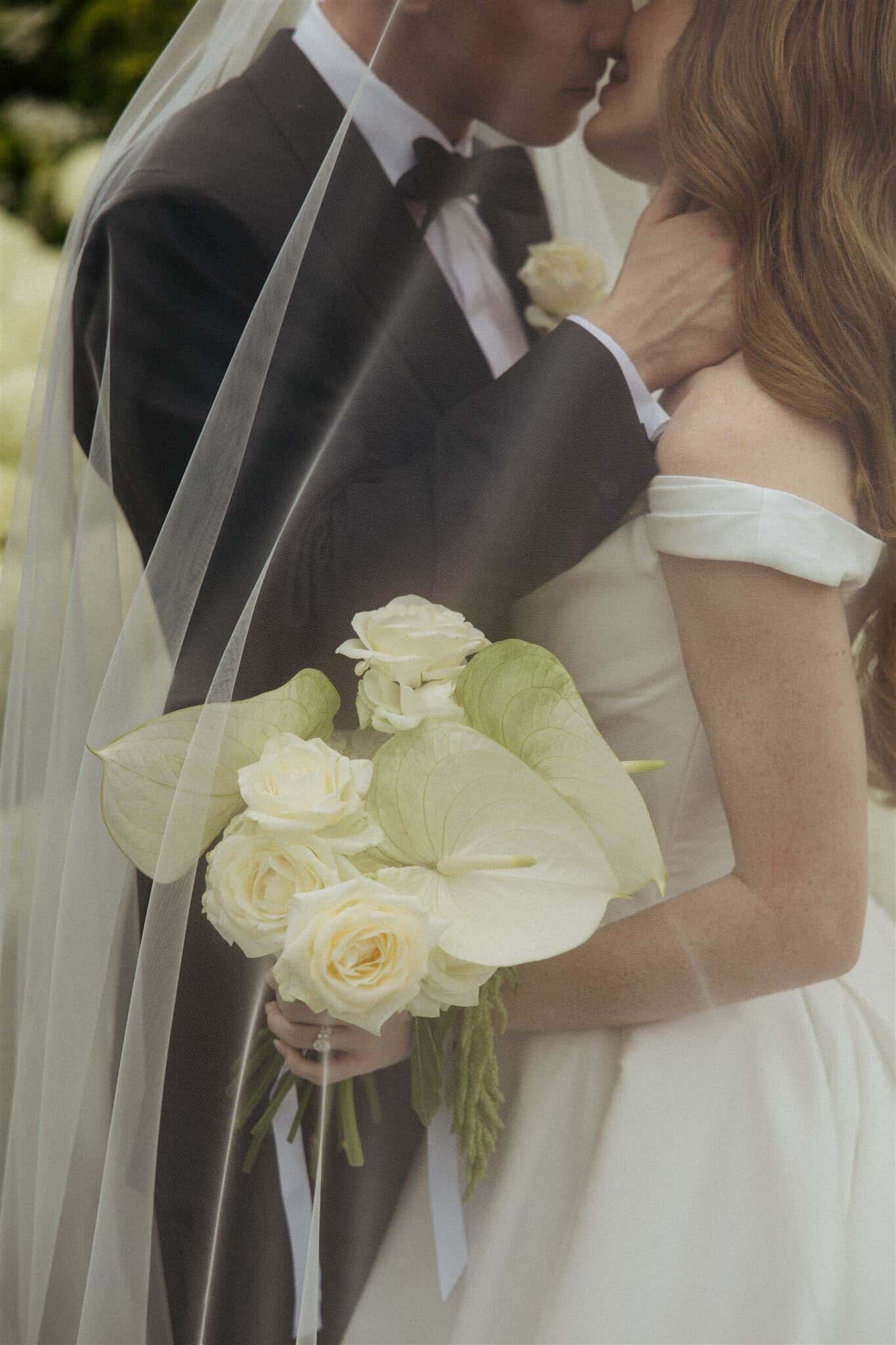 On the wedding day, we focussed on classic white and greens, featuring the bride’s favourite hydrangeas. We styled the ceremony altar with an asymmetrical ground arch with blooming hydrangeas and bright foliage. The dining table was minimalistic; a white base with off-white floral arrangements to pop against the cloths. We added gold and black accents for a point of difference. The guests were serenaded at dinner with a solo saxophonist performance, which set the tone perfectly. Dinner came to an end when Kimi and Arty headed to the end of the table for their champagne tower and sparklers. The after party was in the Ballroom, and the guests danced all night under the statement chandeliers.