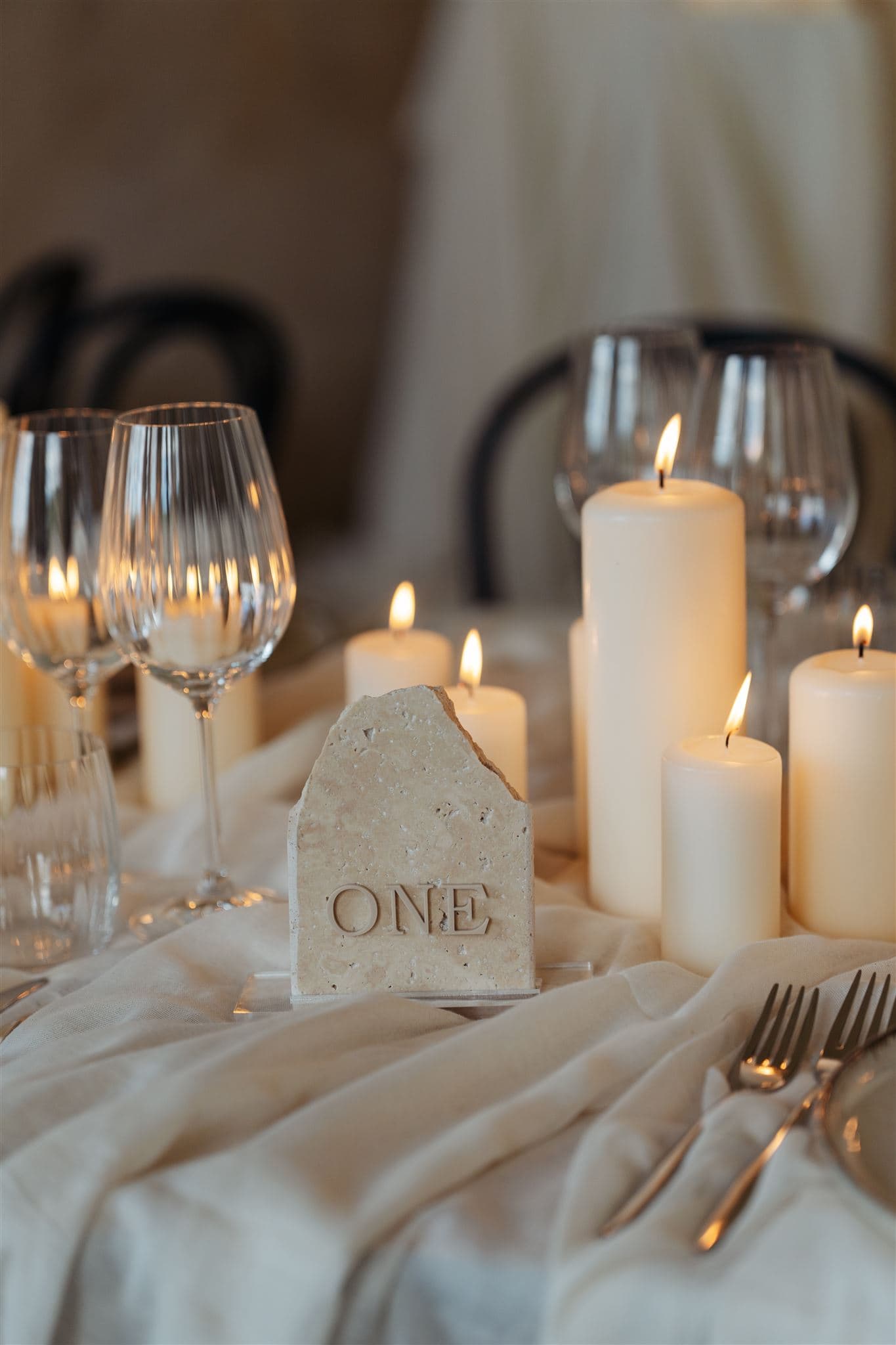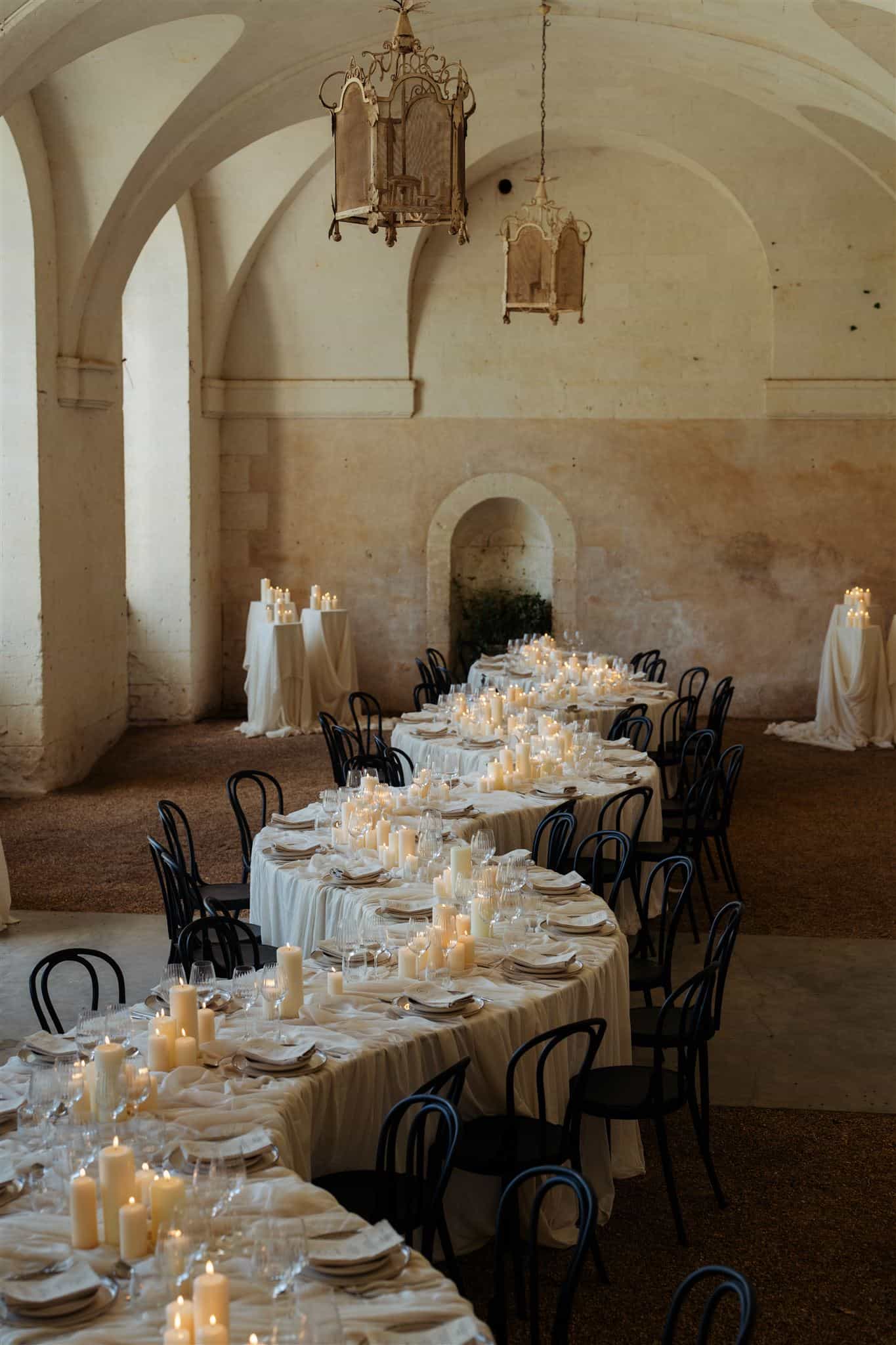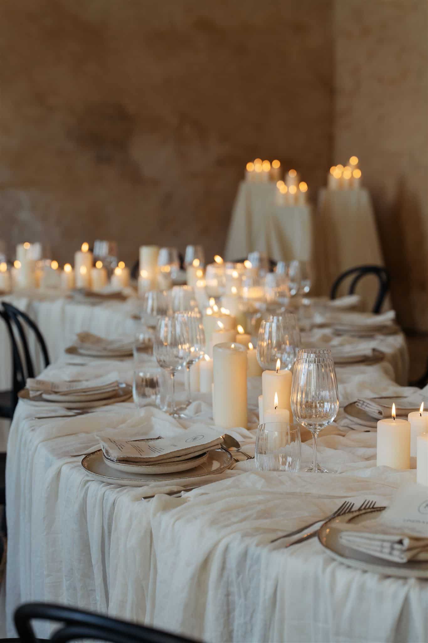 The weekend of events began with a formal rehearsal dinner, with the couple seeking a whimsical and ethereal feel. To pull this together we used serpentine tables styled with bespoke linen draping and menus, as well as stone table numbers and tableware. The candle only centrepiece was breathtaking and after dark created the most beautiful romantic glow.