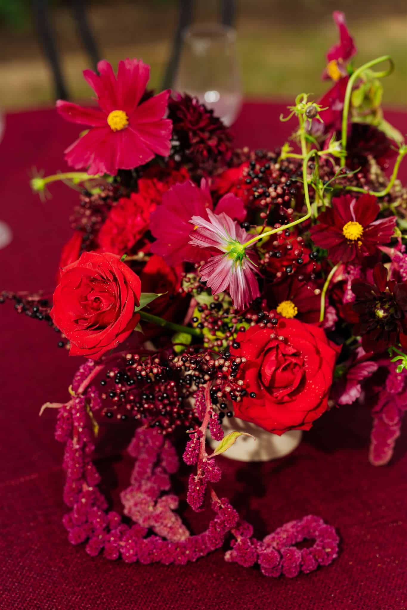 The post-wedding pool party was our Sunday event. We created a bespoke menu with the chef with the couple’s favourite bitesized foods, which the guests could graze on throughout the day. The couple’s signature ‘Siamtini’ cocktail was featured during this event, paying homage to their famous dinner parties. As the sun was setting, we transitioned down to the lower gardens for the farewell dinner. Burgers and fries were served and we went for monochromatic burgundy styling, to make sure we didn’t complete the weekend without a pop of the bride’s favourite colour.
