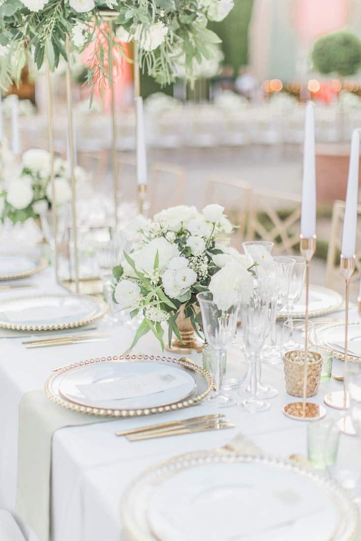 We always work with the surroundings to enhance the design for each wedding. When we visited the venue, we looked down from the balcony to where dinner would be hosted and were inspired to use the cross-shaped pathways as the layout for dinner.