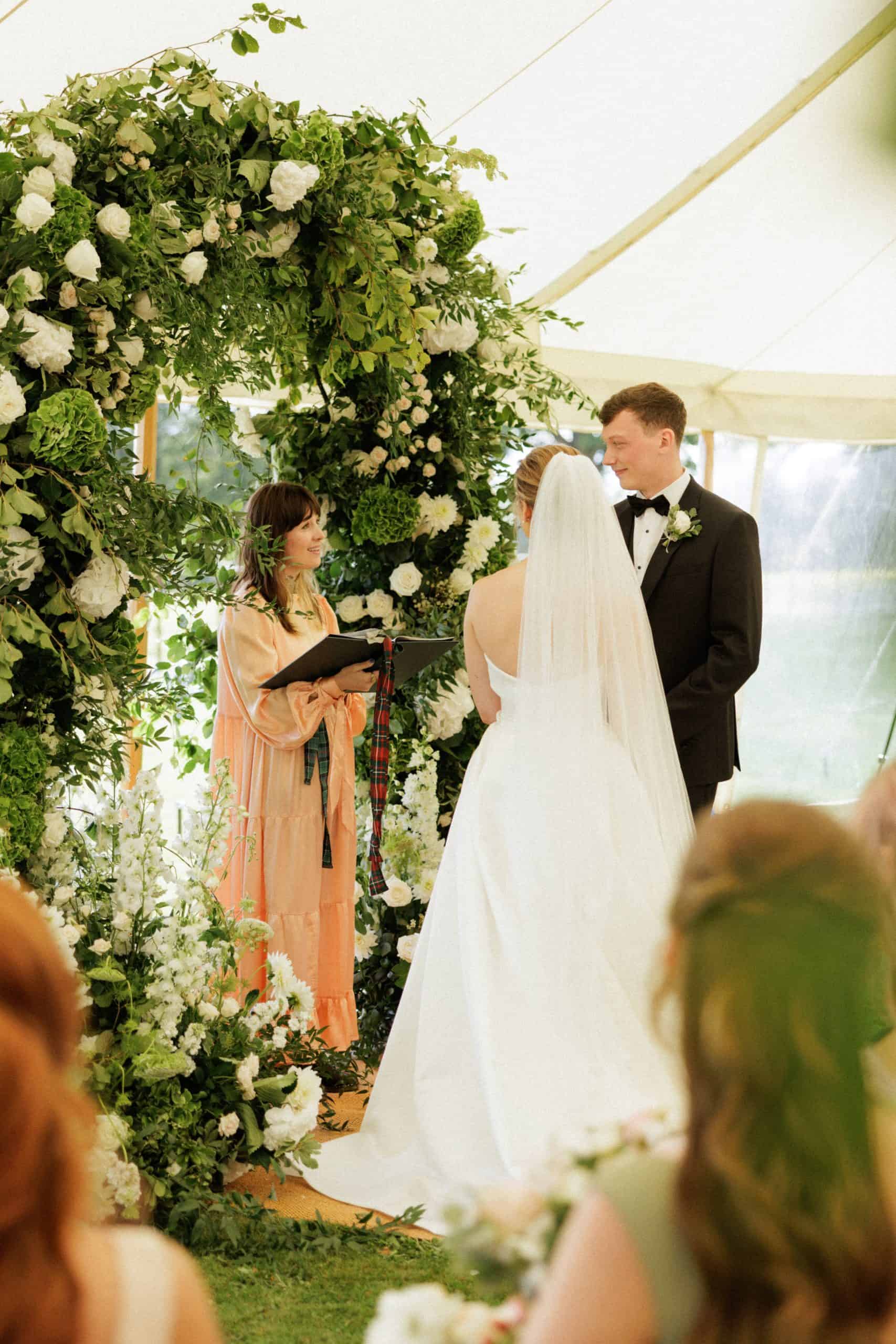 O&J opted for 2 sperry tent structures for their wedding day. We kept the ceremony tent simple, and let the wild floral arch do the talking. The groom’s mother is an incredible florist and took on the challenge of wedding flowers. Rosie created lavish arrangements of blooms across the estate, ranging from urns to arches.
