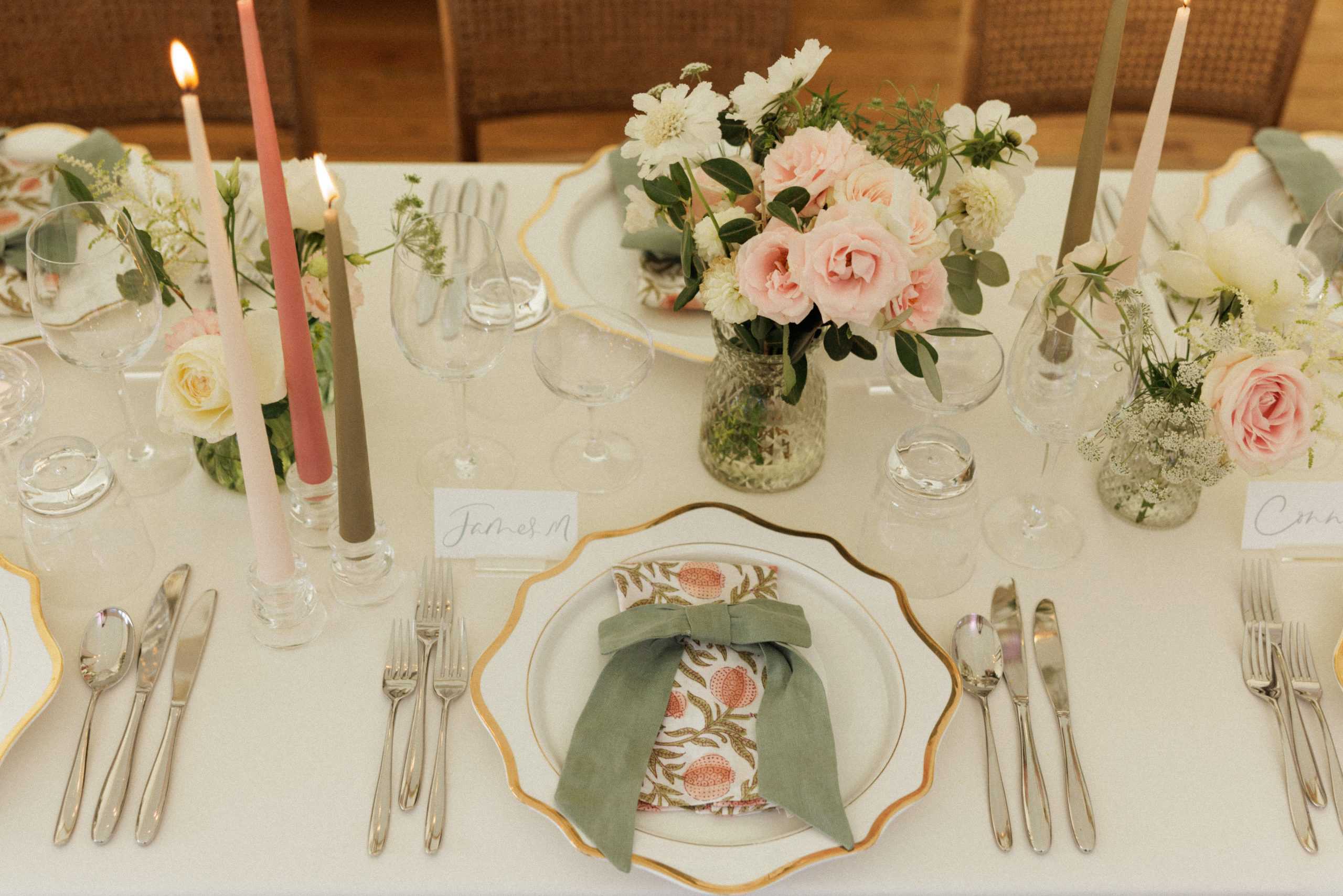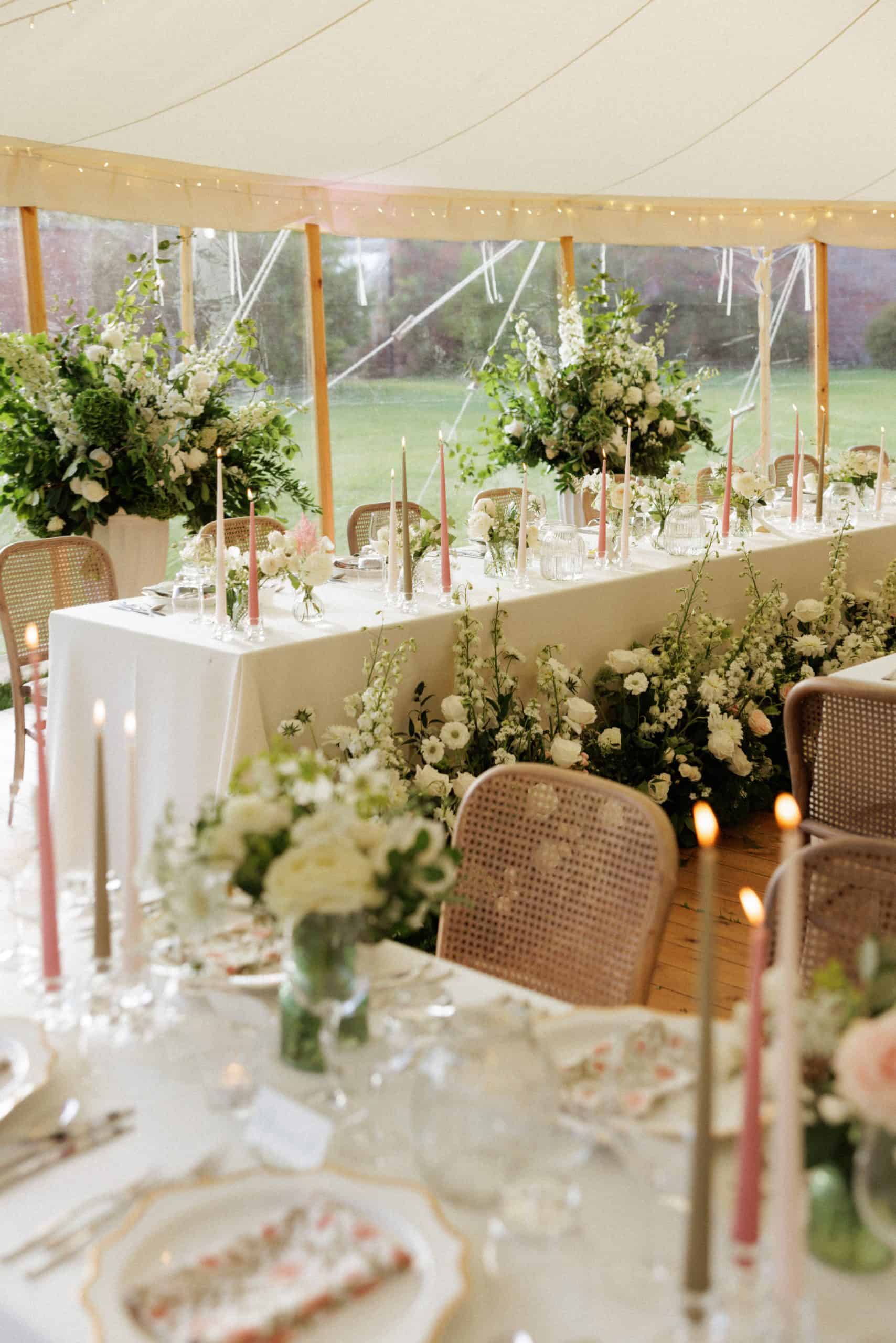 Inspired by the expansive gardens of the estate, we brought the outside in for the reception tent. An abundance of flowers and foliage dressed the sperry tent and the chairs provided a modern twist on a classic wooden look. We went for a classic colour palette of white and green, but featured pops of blush and old rose with our napkins and of course my favourite tapered candles.